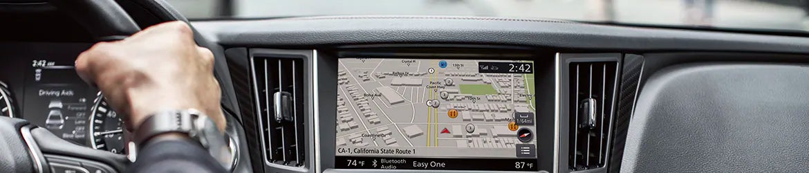 As you take your spot behind the wheel of the 2023 INFINITI Q50, you'll be surrounded by intuitive technology features and modern luxury. Standard features include textured aluminum trim, dual-zone automatic climate control, and leather-appointed seating. Standard features include the INFINITI InTouch system display screens with a 7.0-inch screen on the bottom and an 8.0-inch screen on top, wireless phone integration, and a Wi-Fi hotspot. The Sensory offers enhanced ambient lighting, black open-pore wood trim, and a navigation system with 3-D building graphics and line guidance. Quilted semi-aniline leather-appointed seating and a black matte carbon fiber trim highlight the Red Sport 400.