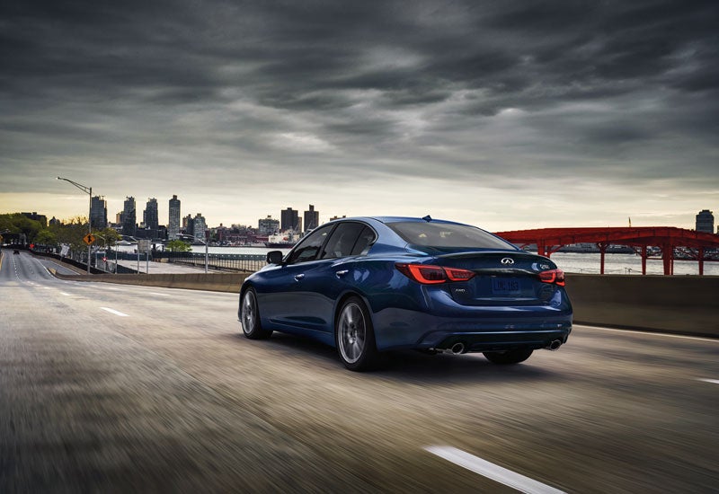 A thrilling driving experience awaits you behind the wheel of the 2023 INFINITI Q50. Rear-wheel drive is standard, though you can opt for an intelligent all-wheel drive system for better traction and control. The INFINITI drive mode select option lets you customize your drive to fit conditions or your mood. A dynamic digital suspension system on the Red Sport 400 offers a more comfortable experience. Additional performance options include a hill start assist, vehicle dynamic control, a traction control system, and brake assist.